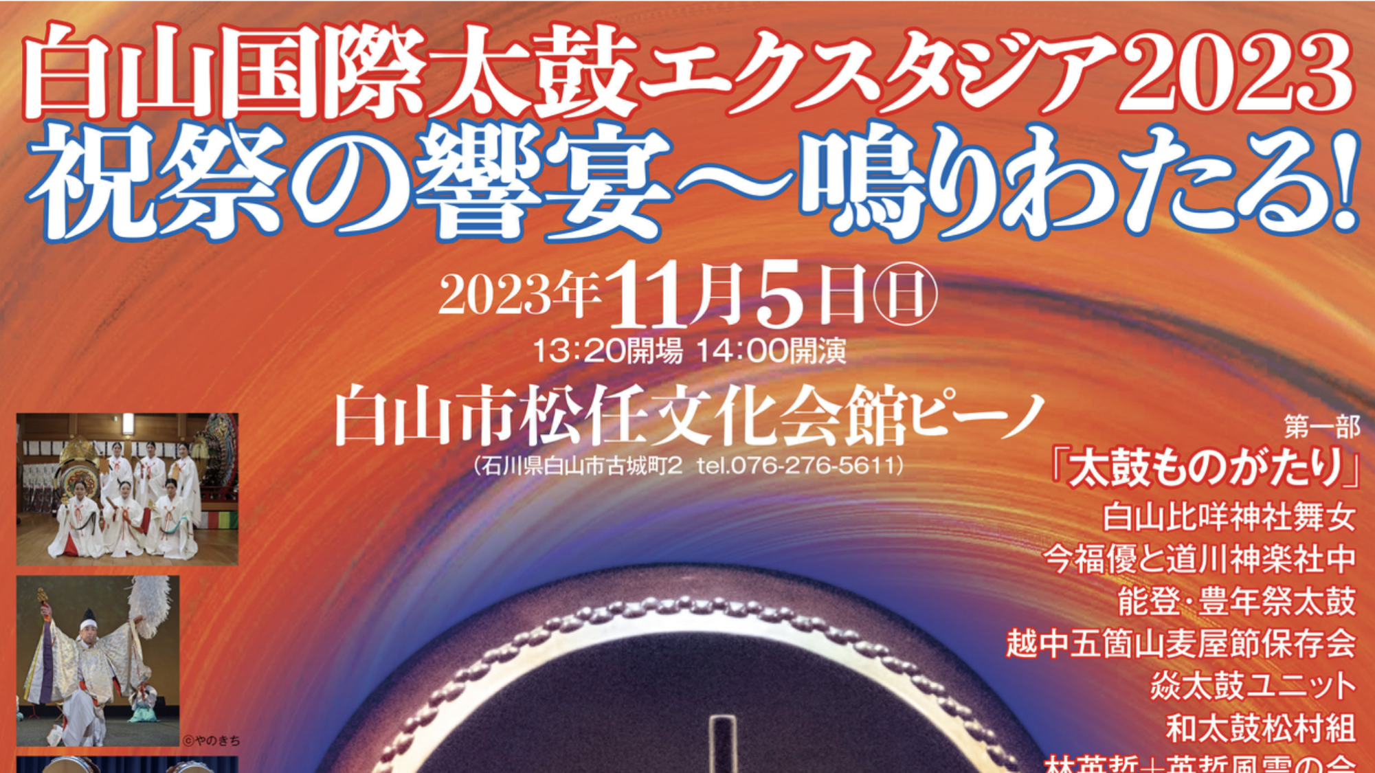 富山地鉄観光のバスを貸し切り、総勢21名で「白山国際太鼓エクスタジア2023」を見てきました。富山インターから約1時間(途中、お弁当)、白山市松任の松任文化会館ピーノ約1200名収容のホールで太鼓の音が鳴りわたりました。